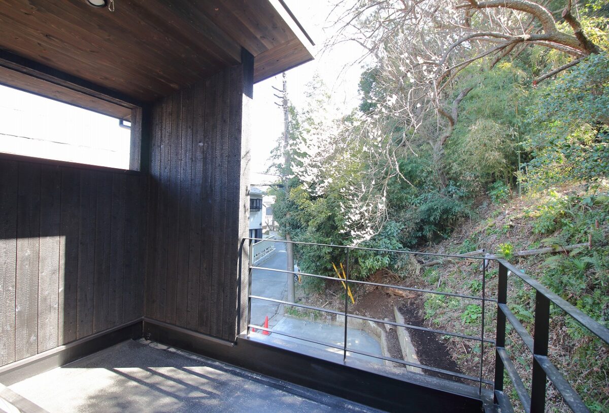 焼いた炭がついている外壁が緑になじんで鎌倉らしい佇まいです。